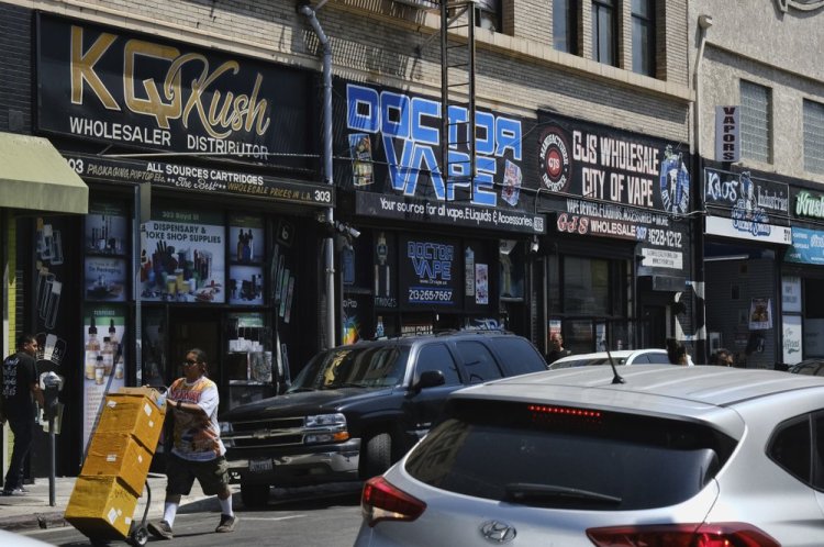 LOS ANGELES (AP) — A short walk from police headquarters in the heart of downtown Los Angeles, a cluster of bustling shops are openly selling packaging and hardware that can be used to produce counterfeit marijuana vapes that have infected California’s cannabis market.