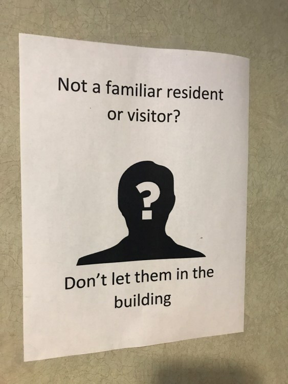 This flyer was installed many times by Kirby Manor staff and many times it was removed by people engaged in illegal activities, so seniors would let them in the building.